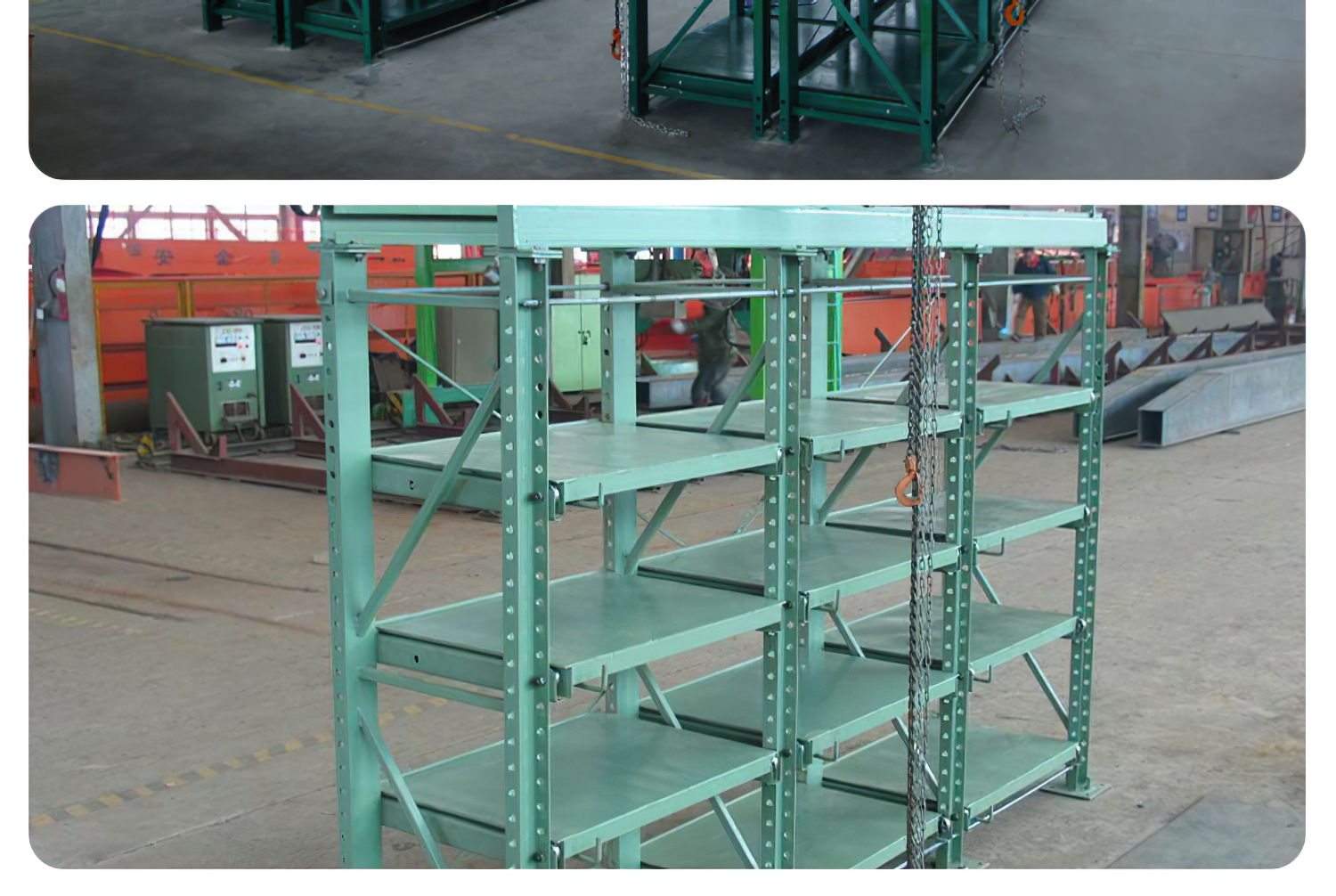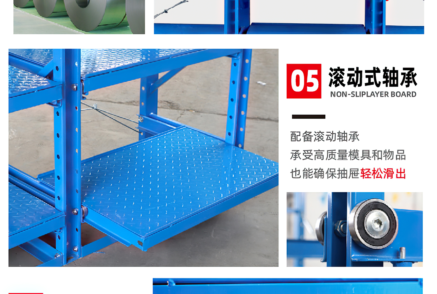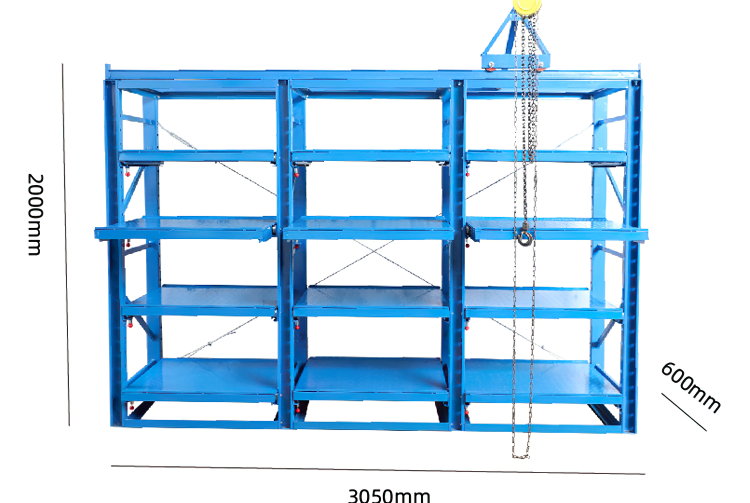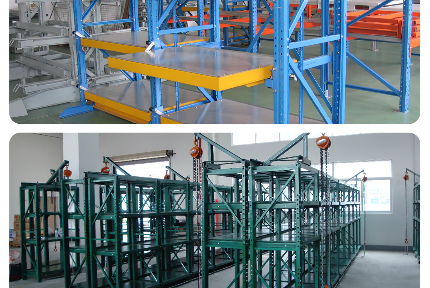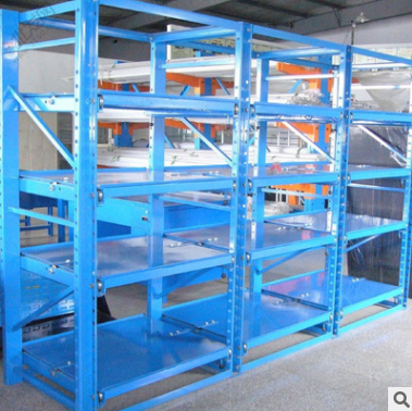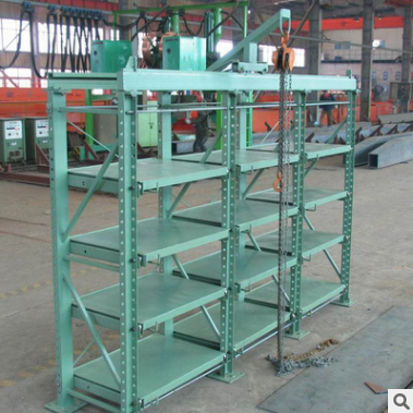抽屜式貨架通常用于存放模具等重物,無需叉車,頂部可配置移動葫蘆車(手拉或電動),可實現模具的起吊,抽屜板底部都設有滾輪軌道,抽屜板承載后仍能自由的拉動,附加定位保險裝置。滾輪軌道是用模具一體成型,精度極高,有極高裝配精度,所以滾輪使用壽命大大延長并且使用時拉出或推入很省力。貨架高度一般在2.5m以下,除頂層外均可設計制作成抽屜式結構,可輕松抽出1000kg/層以內的重物,輔之以行車或吊葫蘆,輕松實現貨物的存取作業。