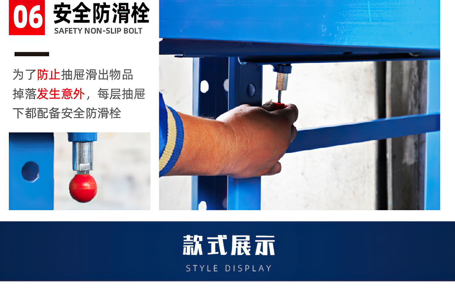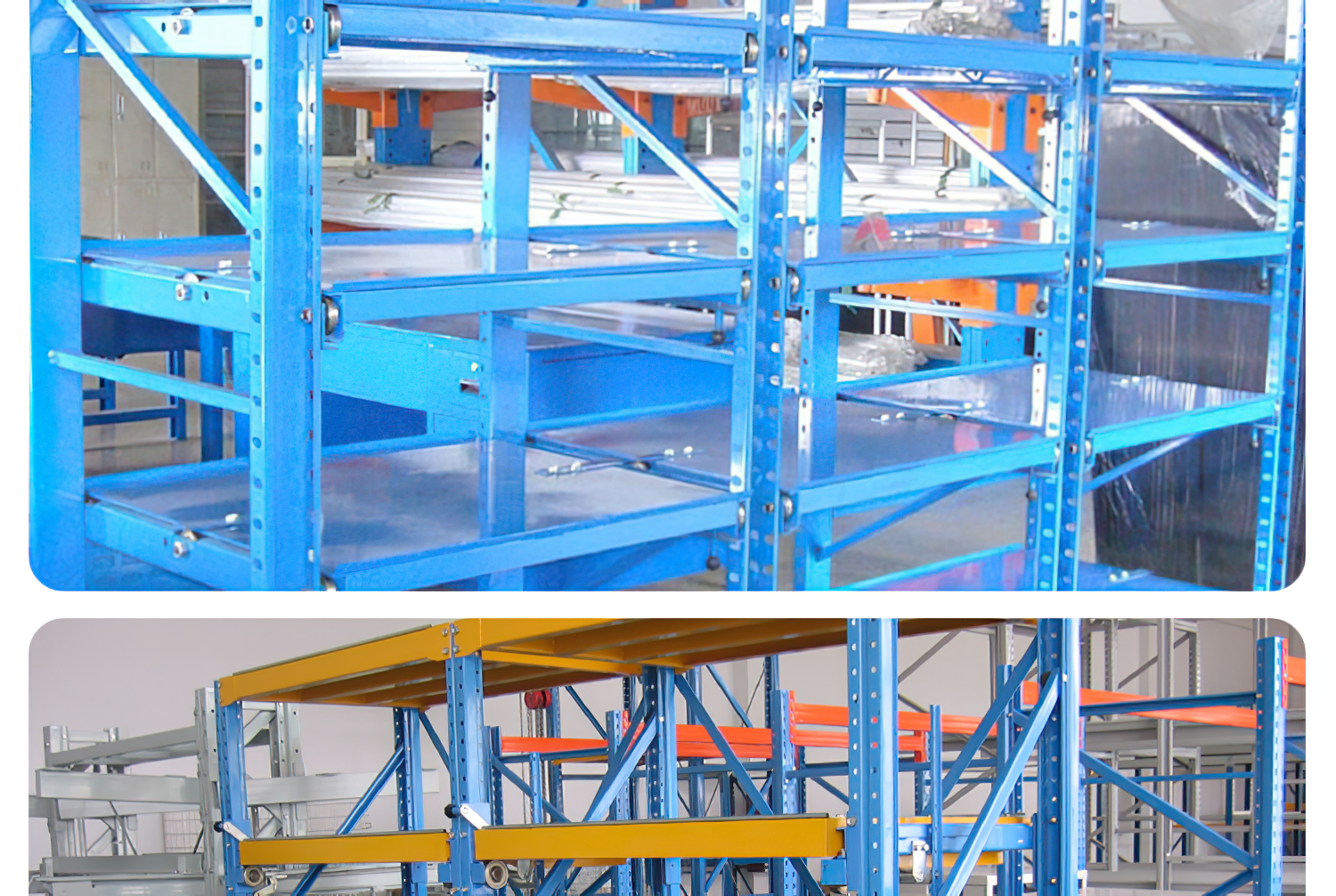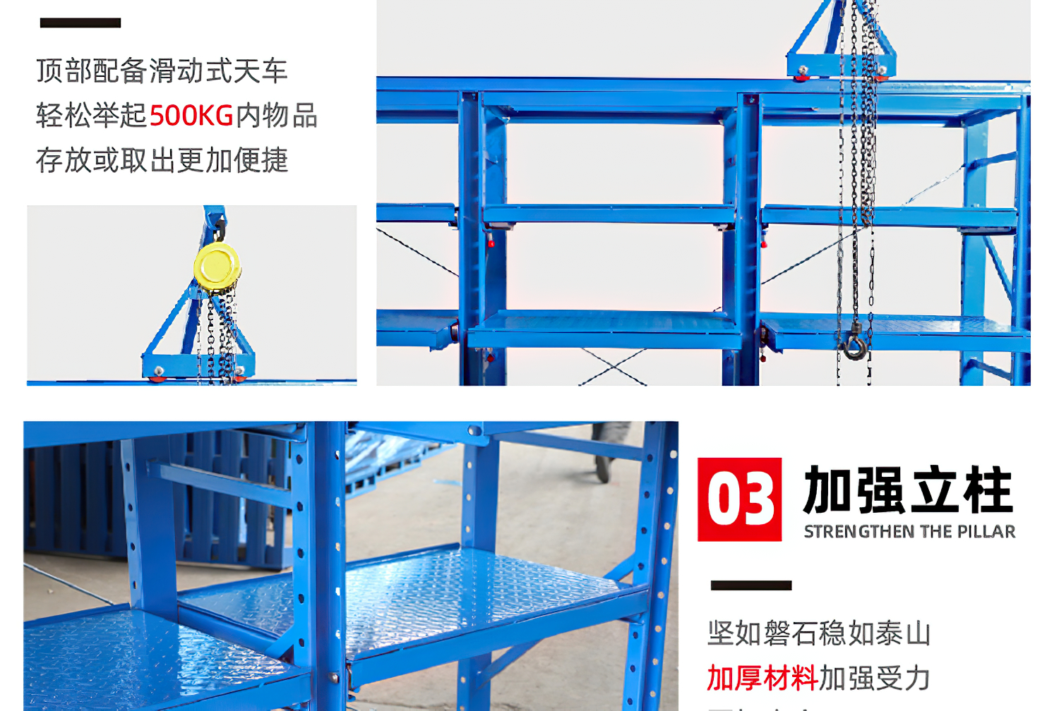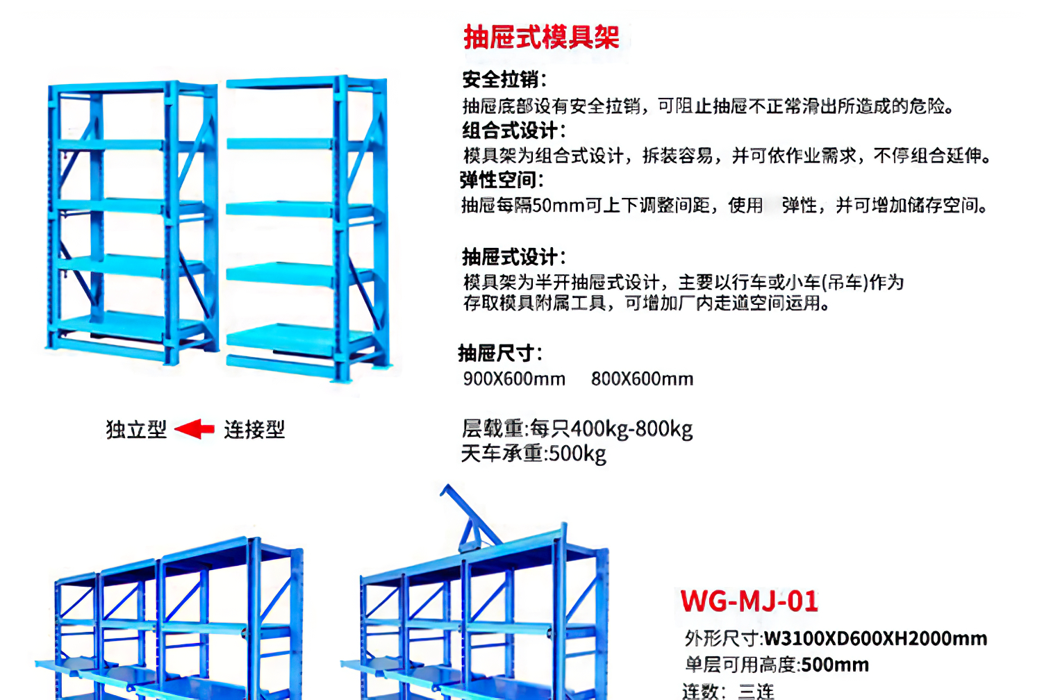 抽屜式貨架通常用于存放模具等重物,無需叉車,頂部可配置移動葫蘆車(手拉或電動),可實現模具的起吊,抽屜板底部都設有滾輪軌道,抽屜板承載后仍能自由的拉動,附加定位保險裝置。滾輪軌道是用模具一體成型,精度極高,有極高裝配精度,所以滾輪使用壽命大大延長并且使用時拉出或推入很省力。貨架高度一般在2.5m以下,除頂層外均可設計制作成抽屜式結構,可輕松抽出1000kg/層以內的重物,輔之以行車或吊葫蘆,輕松實現貨物的存取作業。