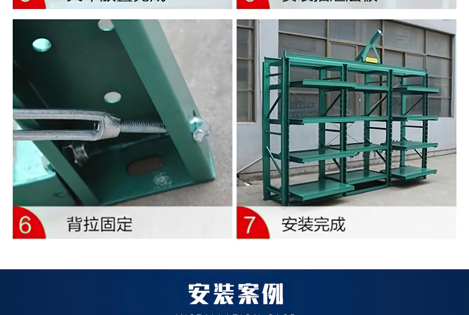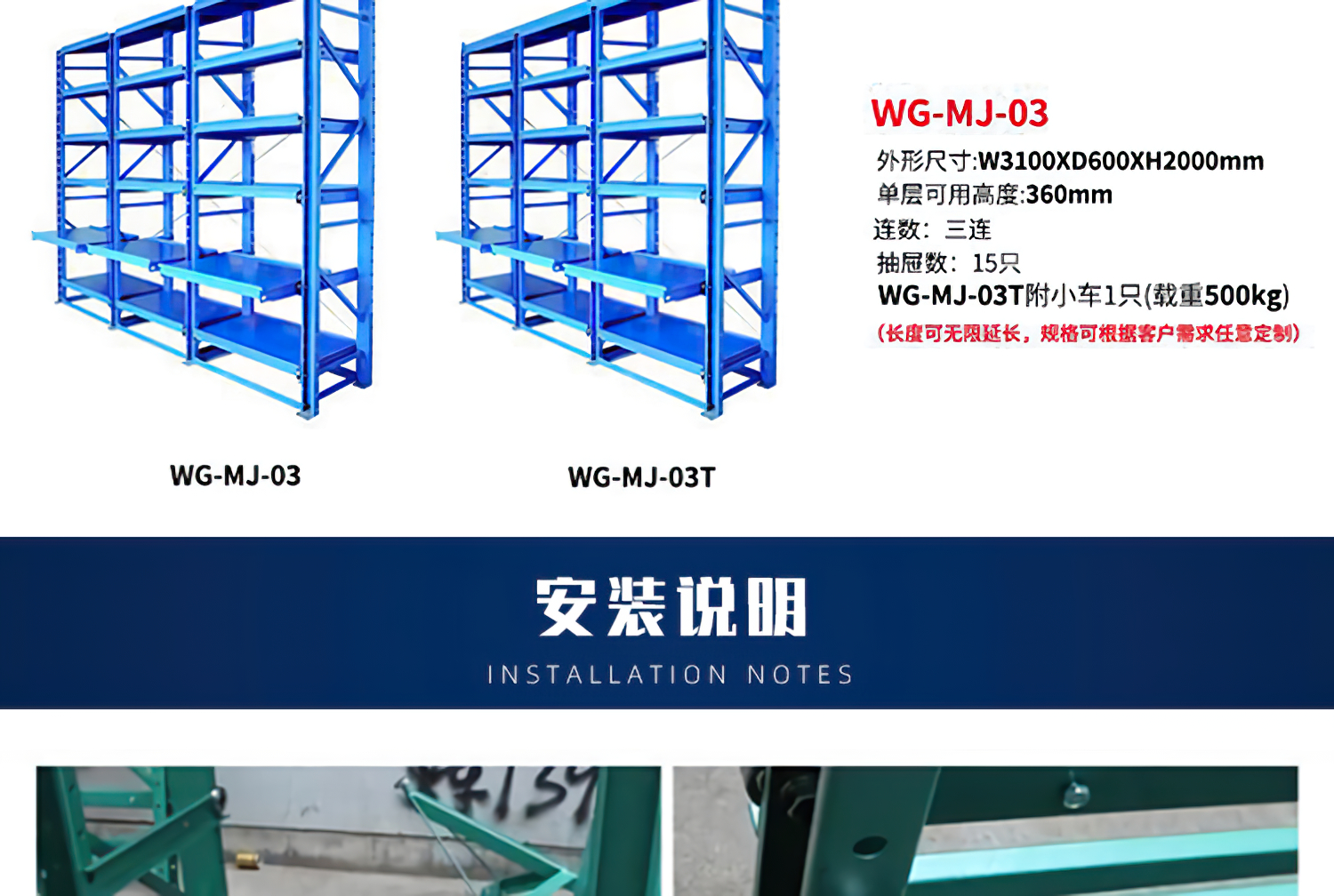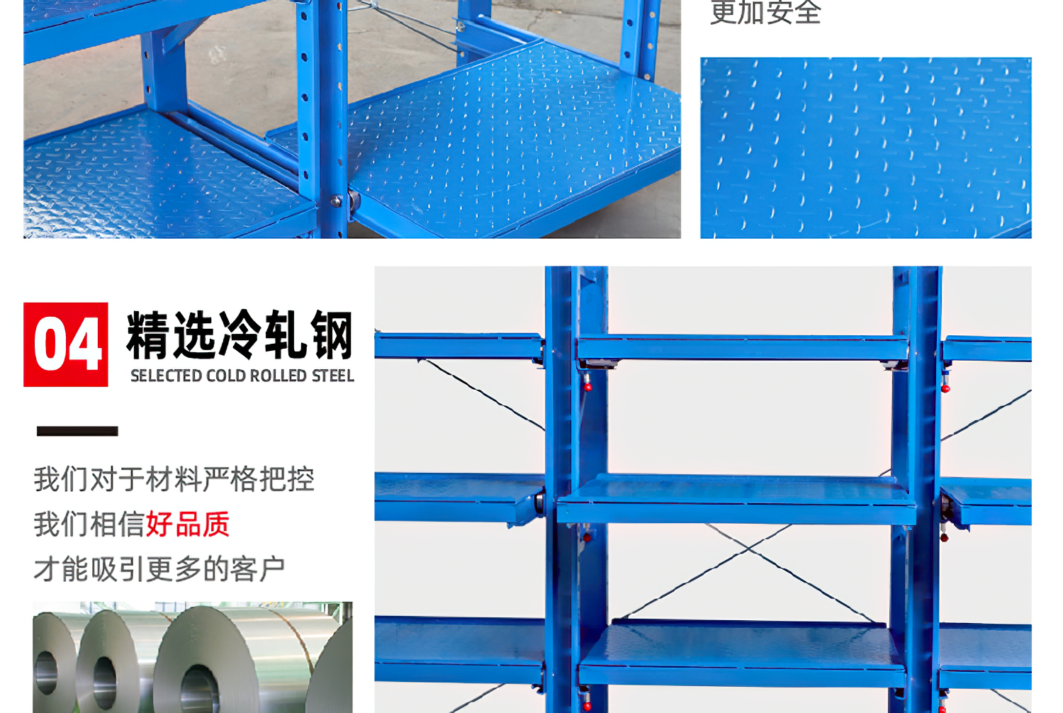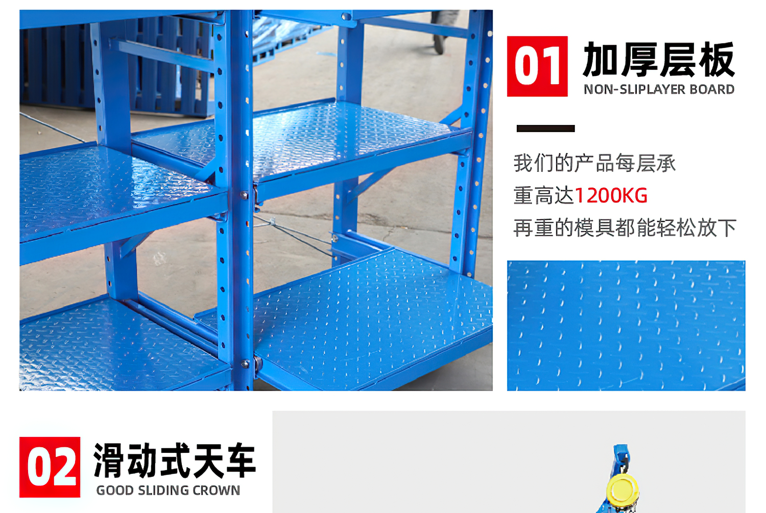 抽屜式貨架通常用于存放模具等重物,無需叉車,頂部可配置移動葫蘆車(手拉或電動),可實現模具的起吊,抽屜板底部都設有滾輪軌道,抽屜板承載后仍能自由的拉動,附加定位保險裝置。滾輪軌道是用模具一體成型,精度極高,有極高裝配精度,所以滾輪使用壽命大大延長并且使用時拉出或推入很省力。貨架高度一般在2.5m以下,除頂層外均可設計制作成抽屜式結構,可輕松抽出1000kg/層以內的重物,輔之以行車或吊葫蘆,輕松實現貨物的存取作業。